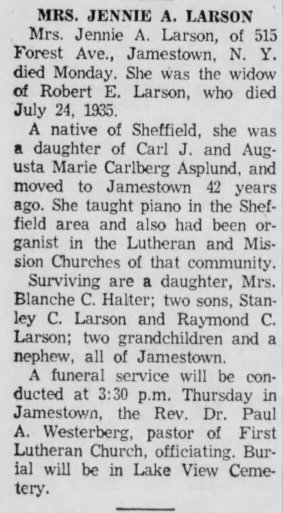 Augusta and Carl Johan’s eldest daughter Jennie marries Swedish Robert Larson and together they have three children; Blanche Constance Evelyn (b. 1904), Raymond Carl Larson (b. 1905), and Stanley Clair Larson (b. 1918). The 1925 state census lists the Larson family at 306 Charles Street in Jamestown. Robert works as a carpenter, Jennie is a housewife, Blanche is listed as a musician, Raymond works as a bookkeeper and the youngest son Stanley is still at school. 24 July 1935, Jennie’s husband Robert passes away, only 59 years old. From 1930 the family lives in a house at 209 Dearborn Street in Jamestown, the house is owned and listed as having a value of $6000. After Robert’s death, the Jennies sell the house and instead rent a house at 158 Sampson Street. Presumably, they cannot afford to stay after Robert’s death.