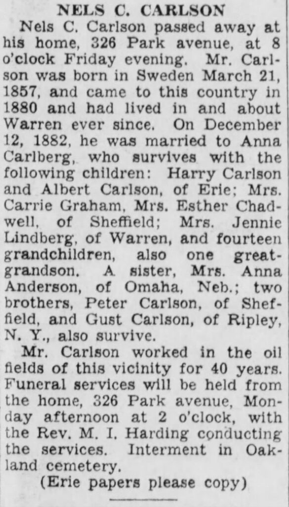 In 1900 the family lived in Glade Township in Warren. Nils worked as a farmer. In 1910, the family still lives in Glade Township, but Nils has now found work as a pumper at the oil fields. At this time, only two of their children remain at home, Harry and Carl Albert. Ten years later, in 1920, Harry and Carl Albert have moved and Johanna and Nils live alone in Warren Bourough where Nils now works at one of the many tanneries. In the end they buy a small house at 326 Park Avenue in Warren. Nils works as a pumper until his retirement and on October 16, 1936 Nils dies aged 79. Johanna remained in the house until December 23, 1943, when she died at the age of 83. Both Nils and Johanna are buried in Oakland Cemetery in Pleasant Township, Warren.