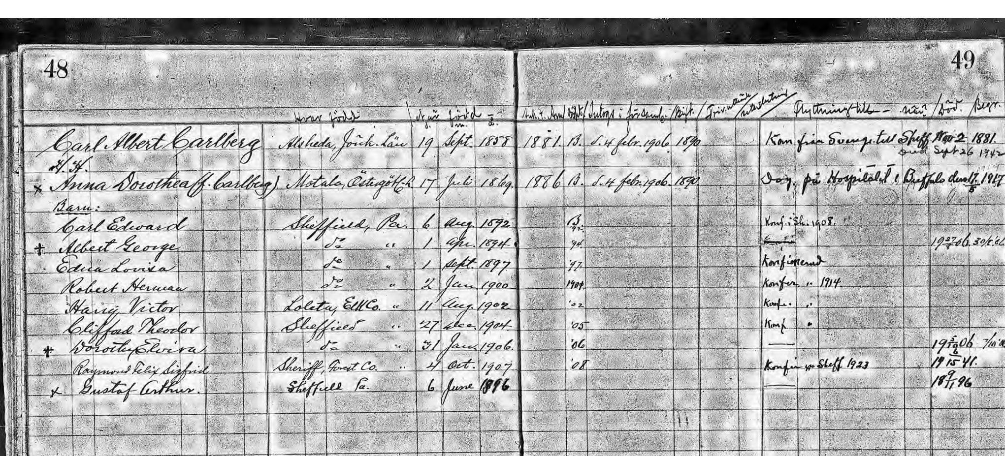 Albert Carlberg followed his sisters when on October 21 1881 he went on the ship Orlando with final destination New York. On 8 May 1890, Albert married another Carlberg, Anna Dorothea Carlberg (b. 1869) in Motala. Together they had nine children: Carl Edward (b. 1892), Georg Albert (b. 1894), Gustaf Arthur (b. 1896), Edna Lovisa (b. 1897), Robert Herman (b. 1900), Harry Victor (b. 1902), Clifford Theodor (b. 1904), Dorothy Elvira (b. 1906) and Raymond Felix Sigfrid (b. 1907). Of their nine children, six reach adulthood. Georg Albert dies only 12 years old, Gustaf Arthur and Dorothy Elvira are only 6 months old when they die.