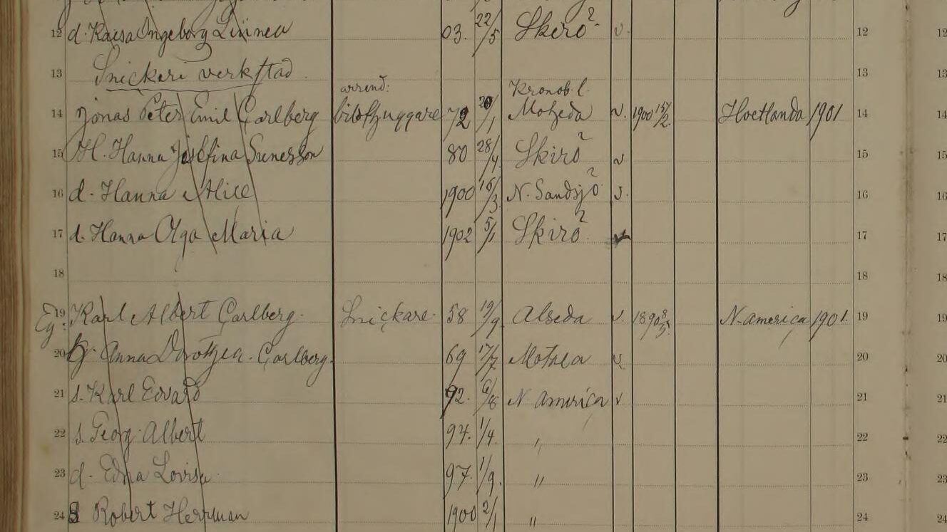 In 1901, Albert and Anna return with their four children; Edward, Georg Albert, Edna Lovisa and Robert Herman to Småland and settle in Skirö outside Vetlanda. The family moves in with Albert’s brother Emil Carlberg, who works as a sculptor in a carpentry workshop that he leases, and there Albert gets a job as a carpenter. Just one year later, on April 8, 1902, Albert and Anna travel back to the United States again and on August 11, the couple’s sixth child, son Harry, is born, which means that Anna made the long boat trip across the Atlantic pregnant with Harry.