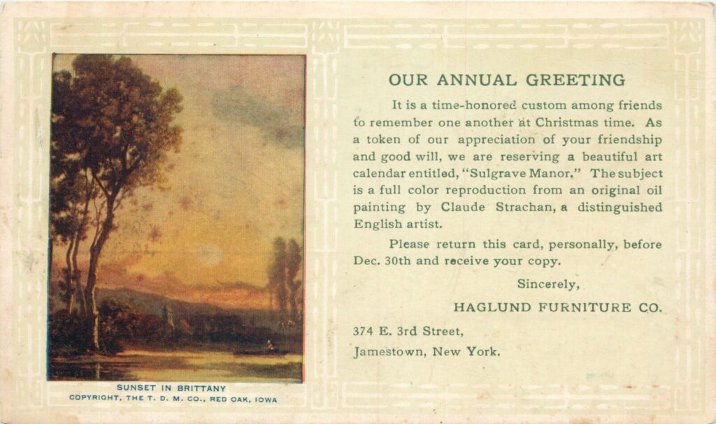 Jennie lives here with her sons, Raymond and Stanley. Since 1925, Blanche has been the manager of The Song Shop in Jamestown. In 1927, Blanche married Russell Carl Alton Haglund, a Swedish descendant whose father came from Sweden. Blanche moves in with Russell and his father, mother and sister. While Blanche works as a music teacher, the entire Haglund family works as furniture salesmen in the family’s furniture store, Haglund Furniture Company, which was one of Jamestown’s oldest furniture stores.