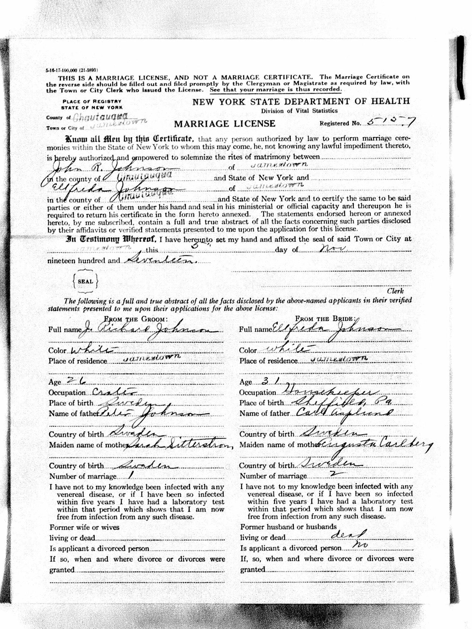 Alfrida, then remarries in 1917 to a John Richard Johnson. John Richard is Alfrida’s second husband and his parents were named Peter Johnson and Sarah ”Sitterstrom” according to the marriage certificate, probably an Americanized version of Sätterström. Johan Rikard emigrates in 1911 and he is the son of a Sofia Setterström and Per Alfred Pettersson Johansson in Alnö, Västernorrland.