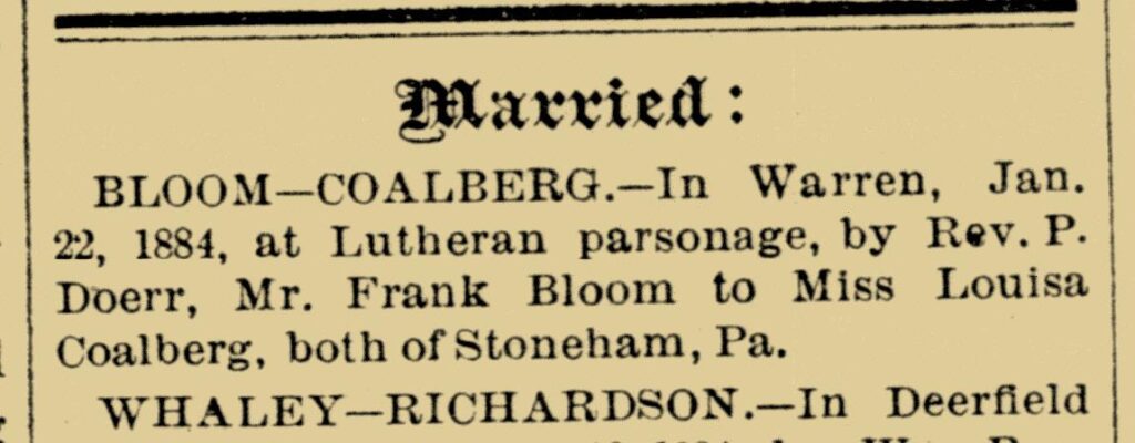Unfortunately, Louise became insane and in 1900 was admitted to the Warren State Hospital For The Insane, where she died on October 4, 1934. Her husband Frank became so upset with his wife that he hanged himself. Their two older daughters moved in with Frank’s brother Charles, who has a farm in Elk Township, Warren, while Frieda moved in with a pastor and his wife, Carl Bergström. Frieda was adopted after her father’s death by the pastor and his wife Christina in Kane Borough, McKean, Pennsylvania.