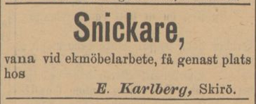 Jonas Peter Emil moves to Norra Sandsjö in 1900 where he marries Hannah Josephina Sunesson, born in 1880 in Skirö. The couple’s first daughter Hanna Alice is born here. Shortly afterwards, Jonas Peter Emil gets work as a carpenter in Vetlanda and the family moves to the Norresand quarter, No. 84. They live here for only a short period when in December 1901 they move to Skirö. In 1901, Jonas Peter Emil leases a carpentry workshop together with his brother Albert, who has returned from the USA with his family. Jonas Peter Emil is a wood sculptor while his brother Albert is a carpenter. In January 1902, Jonas Peter Emil and Hanna Josephina’s second daughter, Hanna Olga Maria, was born.