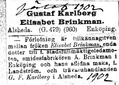 Meanwhile in Enköping, Gustaf worked as a clerk at the timber merchant Oskar Emanuel Feldt and lived in Femte kvarteret, Södra roten. In the same area lives Maria Elisabeth Brinkman, daughter of the city council member and master blacksmith Axel Brinkman and his wife Maria Amalia Landström. Gustaf and Elisabeth meet during this period because Elisabeth eventually becomes pregnant and gives birth to daughter Agnes Ingeborg Elisabeth on 14 November 1900. Elisabeth and Ingeborg stay with Elisabeth’s parents until May 1902 when they move to Hjeltevad where they rent a house on Böresbo estate in Ingatorp, now Gustaf works as a wood dealer. After several years as a clerk and most recently at the wood goods dealer in Enköping, Gustaf has gathered experience that allows him to now start his own business.