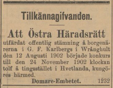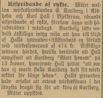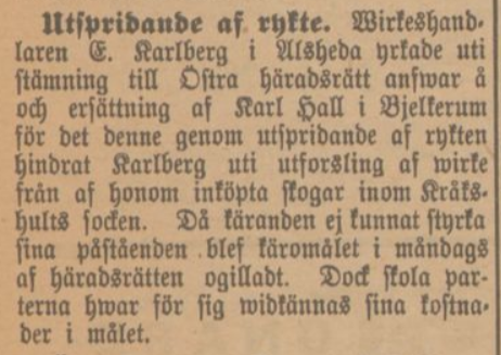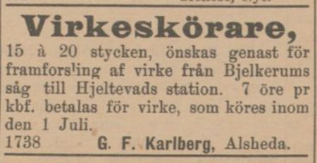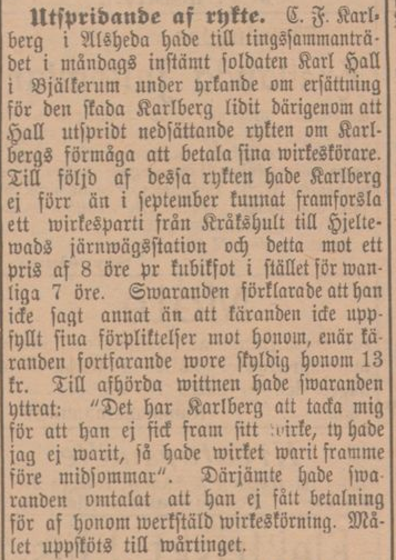 Gustaf works as a timber merchant but runs into problems and finds it difficult to get money. In three articles in the Vetlandaposten, one can read that Gustaf claims that the soldier Karl Hall in Bjälterum is said to have spread disparaging rumors that Gustaf does not pay his woodcutters. In the first article, Karl Hall claims that he has not been paid what he was promised and said in the Autumn Parliament in October that: ”Karlberg has me to thank for not getting his wood, because if I hadn’t been there, the wood would have been arrive before midsummer” According to Gustaf, Hall’s statement had made the local lumberjacks pull away to drive for Gustaf.