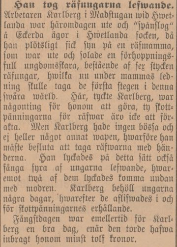 The worker Karlberg in the Madstugan near Vetlanda was out the other day ”scooping” on Eckerda’s property in Vetlanda parish, when he suddenly saw a mother fox, who was out sunbathing a group of hopeful young people, consisting of six fox cubs, who now, under the mother’s leadership, would take the first steps in this world of ours. Here, Karlberg thought, there was something for him to do, because the fines for foxes are not to be despised. But Karlberg had no gun and no other weapon, so he had to decide to take the foxes with his hands. In this way he also managed to capture four of the cubs alive, whereas two of them managed to escape with the mother. Karlberg kept the cubs for a few days, after which they were euthanized in order to obtain the fines. The capture day was, however, a good day for Karlberg, as it must have brought him at least twelve kroner. Vetlandaposten 27 July 1900.