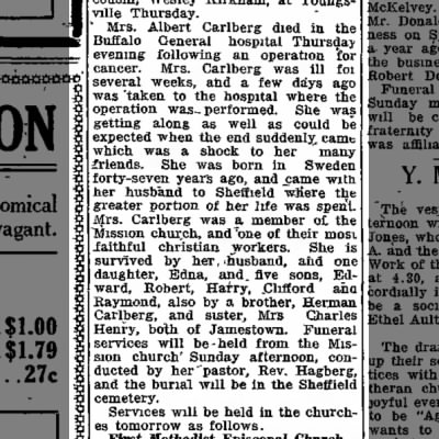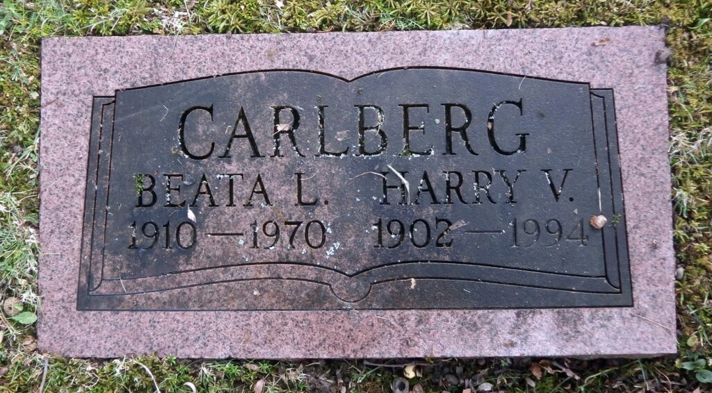 The son Harry Carlberg married, just like his sister Edna, in 1930. Harry’s wife’s name was Beata Lenora Johnson (b. 1910), whose parents also came from Sweden. Together with Beata, Harry had five children; Joyce Elaine (b. 1931), Doris Jean (b. 1933), Stanley B (b. 1945), Geraldine (b. 1946) and Allan (b. 1950). In 1940 they live at 76 Johnson Street in Jamestown. Harry works as a machinist at one of the city’s many industries, in 1957 he is a machinist at MR Corp. In 1970, Harry’s wife Beata passes away aged only 68. Harry lived until July 21, 1994. Harry and Beata are buried at Lake View Cemetary in Jamestown.