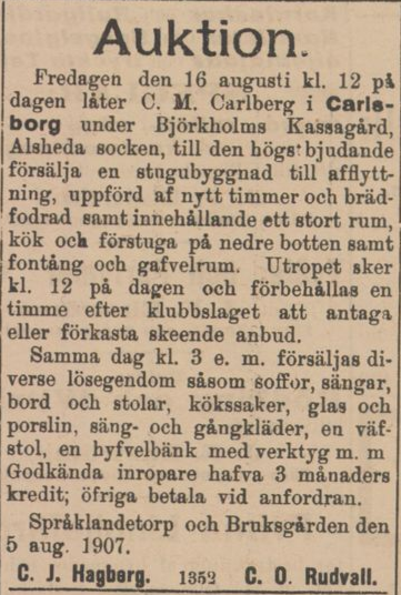 1907 Carl Magnus moves to Björkholm Kassagård in Alseda. He lives there only for a short time before he sells the croft and remarries on 25 July 1907 to Emma Pettersdotter from Nottebäck, who is 25 years younger than him. Carl Magnus died on 25 February 1921 in Rydlund croft under No 4 Ämmaryd Kåragård, after a long life at the age of 86. His wife Emma stays until 1929 when she is moved to ”Trollhälla poorhouse” under Alseda rectory. She lived here until her death in 1945.