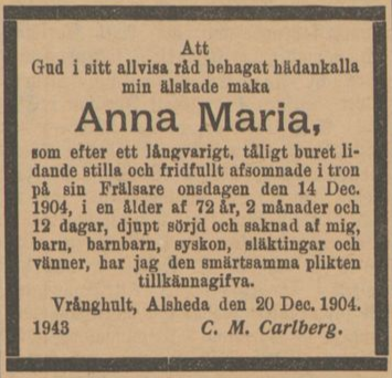 Carl Magnus works as a miner until 1886. In 1887, Carl Magnus and Anna Maria move to Vrångshult with their sons Frans August and Jonas Peter Emil. Anna Maria died in 1904 of dropsy (water swellings due to kidney or heart failure).