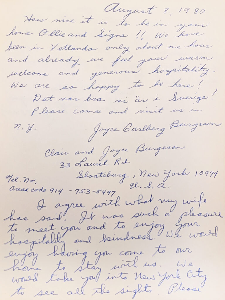 Joyce Carlberg marries Clair Burgeson 1954 and in august 1980 they visit Olof and Signe (my farfar and farmor) in Vetlanda, Sweden. Images below from Olof and Signes guestbook.