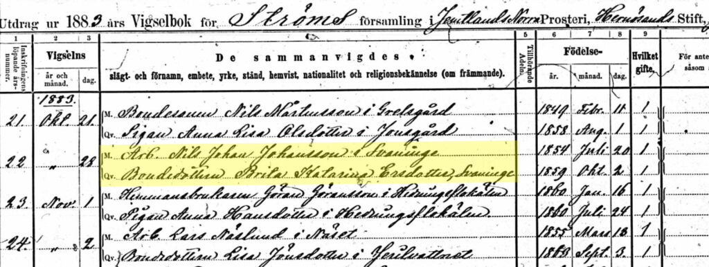 Den 24 augusti 1883 var en söndag. Den dagen befann sig Britta Katarina och Nils Johan i Ströms kyrka, troligen för att lyssna till förstagångslysningen mellan arbetaren Nils Johan Johansson och Britta Katarina Eriksdotter, Prosten Wagenius har i Ströms husför hörslängd antecknat, att dessa båda den dagen mottagit altarets sakrament i Ströms kyrka. Den 28 oktober vigdes de. Sitt första hem hade de i Svaningen. Men vistelsen där blev ej långvarig.