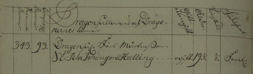 Per Johansson Halling (dragon nr 93 i Hallen (nuv. Hallviken) – därav namnet Halling.) och Erik Olofsson Sundström (nr 116) tillhörde båda majorens kompani av Jämtlands dragonregemente. Enligt 1748 års rulla antogs Per Halling till tjänst den 14 mars 1748 efter Jöns Mårtensson Hallskog. Sundström hade antagits året innan, den 3 juni 1747.