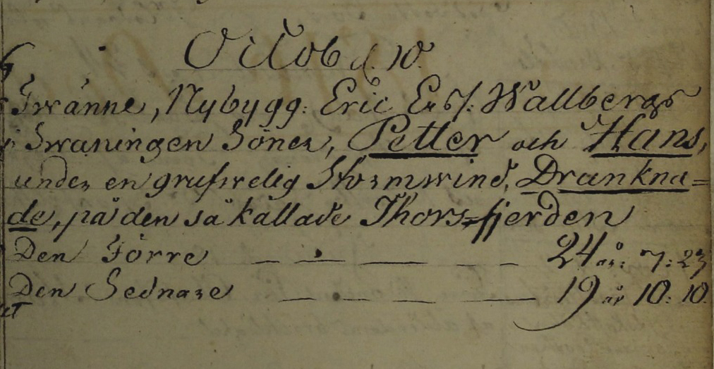 Den 10 oktober 1816 inträffade en dramatisk olycka som kom att förbli ett svart kapitel i familjens historia. De båda sönerna Petter (f. 1792) och Hans (f. 1796) gav sig ut på fisketur i båt på Thorsfjärden. De var vana vid sjön och dess nycker, men denna dag slog vädret om hastigt. En våldsam storm drog in över vattnet. Dagen efter hittades vrakdelar som flutit i land. Någon kropp återfanns aldrig. Så slutade livet för två unga män, mitt i sin krafts dagar. De blev 24 och 20 år gamla.