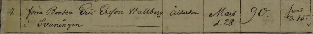 ”Eric – Född d. 2 April, fick nöddop sama dag, som stadfästades d. 5 April. Föräldrar: Drg. Wallberg och m:r Anna Pehrsdotter ifrån Ollvattnet (gammal benämning på Alavattnet). Faddrar: Carl Jonsson i Bredgård, Göran Jönsson i Aspnäs, Olof Brendal i Gerde, Sven Pehrsson i Strännäs, hustru Brita Zachrisdotter i Wallen, Maria Schjulsdotter i Bredkjälen, änkan Göta Pehrsdotter i Torpet, Märet Hansdotter i Bredgård, pigan Märta Pehrsdotter i Ollvattnet och Wallborg Carlsdotter i Bredgård.”